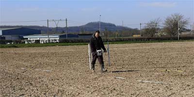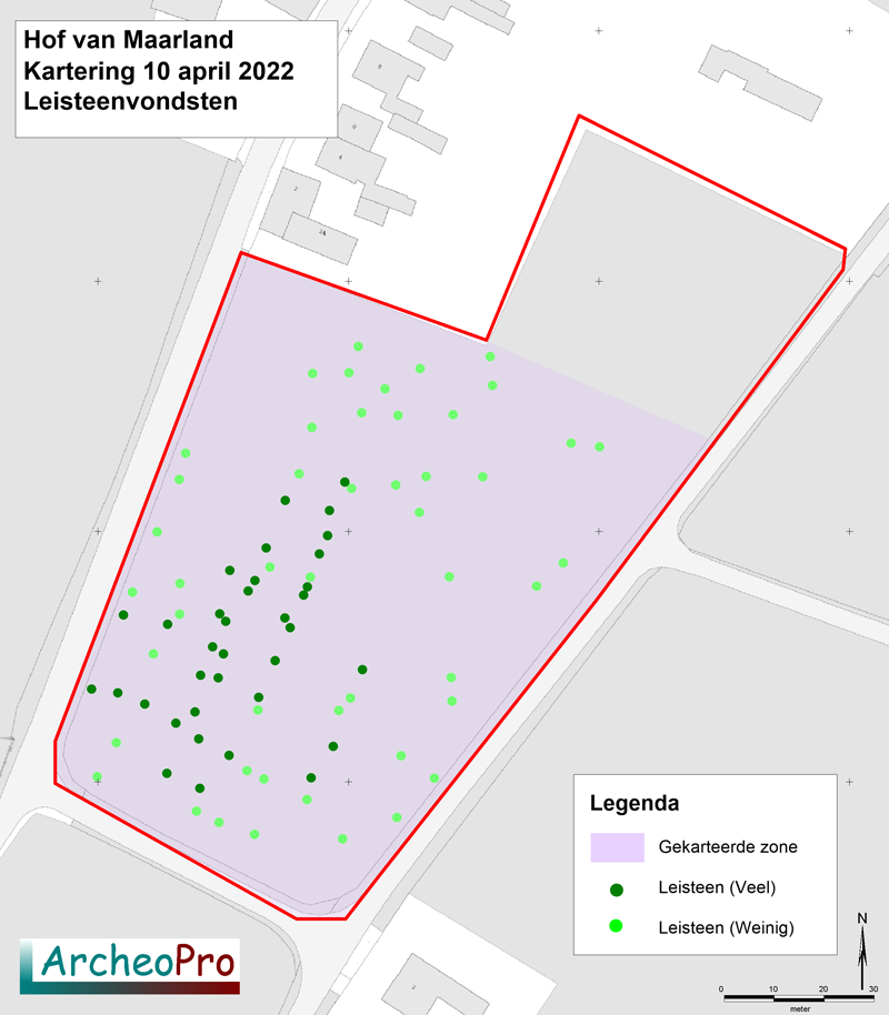 Geofysische testlocatie Hof van MaarlandArcheoPro zocht een locatie vlak bij het kantoor die kan dienen als test locatie om nieuwe apparatuur te testen, prospectief onderzoek onder speciale meetomstandigheden te doen en om nieuwe onderzoeksmethodes uit te proberen. De meeste terreinen die wij onderzoeken, worden na ons onderzoek bebouwd, dan kunnen we niet terug gaan om dingen uit te proberen. We hebben gezocht en een ideale locatie gevonden in de Hof van Maarland, een laatmiddeleeuwse boerderij die als Laathof (lokale rechtbank) gefunctioneerd heeft. De locatie ligt vlak bij ons kantoor. Deze site, die niet bebouwd gaat worden, is daarmee voor ons een ideale test site. Ook de eigenaar en pachter vinden het goed dat wij onderzoek doen op deze locatie. BureauonderzoekHet onderzoek begon met een zoektocht naar een geschikte locatie. Een akker aan de zuidrand van het dorp Maarland bevat volgens de archeologische dossiers een middeleeuwse kapel en mogelijk een Romeinse tempel, gebaseerd op een oude melding uit 1865 (Habets 1865). Dat zou een perfecte testlocatie kunnen zijn. Doorzoekend in de archieven maken twee andere locaties vlak bij ook aanspraak om diezelfde middeleeuwse kapel te hebben. Op die twee andere locaties is eerder al onderzoek verricht waarbij inderdaad een middeleeuwse kapel en een middeleeuwse boerderij aangetroffen zijn. Hoe zit het dan met het door ons uitgezochte terrein? Verder onderzoek in publicaties levert een voorzichtige aanwijzing op dat mogelijk een laatmiddeleeuwse boerderij met laathof op ons testterrein gelegen heeft, genaamd de Hof van Maarland (Hartmann 1986). Deze laathof moet rond 1500 gebouwd zijn maar was in 1600 alweer verdwenen. Van de Romeinse tempel wordt nergens melding gedaan, alleen een opmerking uit 1865 dat er misschien een romeinse voorganger geweest is (Habets 1865). Het is belangrijk naar de locatie te kijken. Deze locatie is ideaal voor een boerderij. Het perceel ligt op de rand van het middenterras van de Maas, net iets hoger dan het laagterras aan de westkant. Ook past de locatie heel goed in het patroon van het wandelende dorp Maarland dat vanuit het zuidelijker gelegen Breust gesticht is. Uit historische bronnen is bekend (Hartmann 1986) dat Maarland in het gebied rondom ons onderzoeksterrein gesticht is als agrarische ontginningsnederzetting. Toen de agrarische ontginningen zich in noordelijke richting verplaatsten, schoof de kern van het dorp mee naar het noorden. De Hof van Maarland is daarbij afgebroken, vergeten en opgenomen in het agrarische perceel zuidelijk van de huidige kern van Maarland. Alleen de kapel bleef in gebruik, losgeweekt van het verplaatste dorp. Van de Hof van Maarland zijn geen kaarten en afbeeldingen bekend. Er zijn wel kaarten waar de Remigiuskapel op staat. Deze kapel is in 1860 tijdens de aanleg van de spoorlijn verdwenen. De Tranchotkaart uit 1805 in onderstaande afbeelding laat bij B een gebouw zien dat kort bij de weg ligt. Bij A is een boomgaard aangegeven zonder aanwijzingen voor een gebouw.