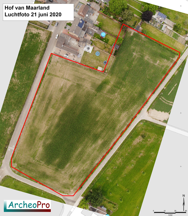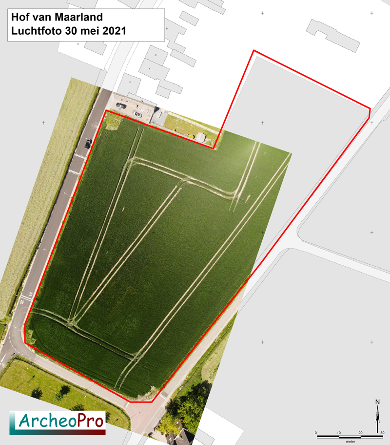 Luchtfoto'sIn de archeologie worden luchtfoto's gemaakt om archeologische structuren ondergronds te herkennen. De archeologische structuren, als ze niet te diep zitten, beïnvloeden de groei van de gewassen, dit is te zien vanuit de lucht. Onze testsite Hof van Maarland is ook hiervoor een mooie testsite. Om de paar weken wordt een dronevlucht gemaakt boven de site om te volgen wat het gewas doet en hoe de archeologie zich in het gewas aftekent. In maart 2020 is het terrein door de landbouwer bewerkt