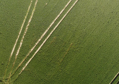 In onderstaande luchtopname is goed te zien hoe de muren zich aftekenen in het groeiende gewas.